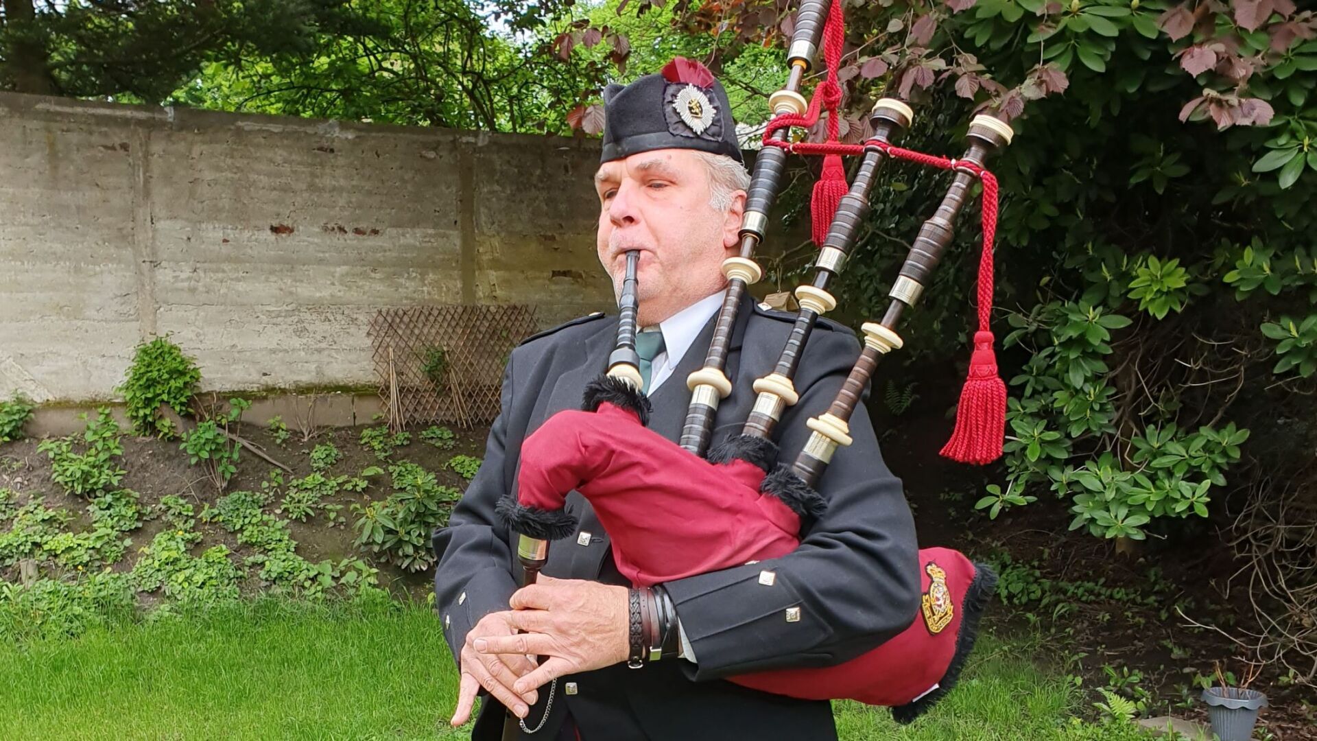 Frank Kessel has been playing bagpipes at events solo and as Sassanceltix and as a piper for the Rhine Area Pipes and Drums. He played various bagpipe tunes to the delight of the celebrant Inge on her 90th birthday and the various viewers who joined the celebration from their balconies and windows. For the old Scottish song "Loch Lomond " Luna (13) had to adapt her voice to the lower tune of the bagpipe.